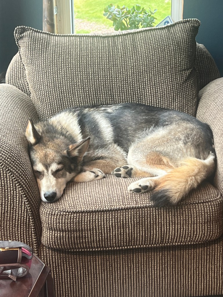 Qarth officially retired in the summer of 2023 at eight-years-old. And to our utter amazement, he became friendlier and more outgoing than we ever thought possible. Once away from his dog house, he felt free to approach or dodge our visitors at will. Eventually he gave up the barking, and was all tail-wags for anyone who came down the driveway. He came to love soaking up attention from anyone and everyone, and made up for all of those years of being so camera shy.